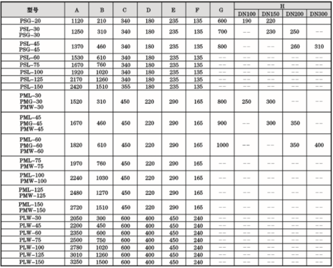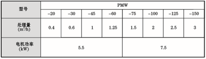 注:污水中的渣滓浓度为30ppm;处理量为流入水位在破碎机开口上限,流出水位在破碎机开口下限时的处理量;功率栏中无括号值为普通电机功率,括号内数值为水陆两种电机功率。