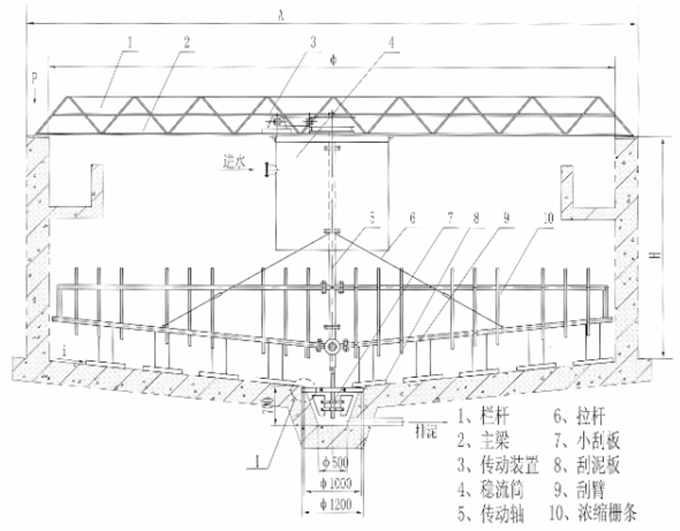 浓缩机由中心传动装置驱动传动轴,刮臂等旋转,刮臂上的刮板将污泥由池边逐渐刮至池中心的泥坑中,通过排泥管排出池外;刮臂上固定有搅拌栅条,旋转时扰动污泥使水和气体外溢,提供絮状污泥的沉淀空间,加速污泥的下沉,提高浓缩效果。